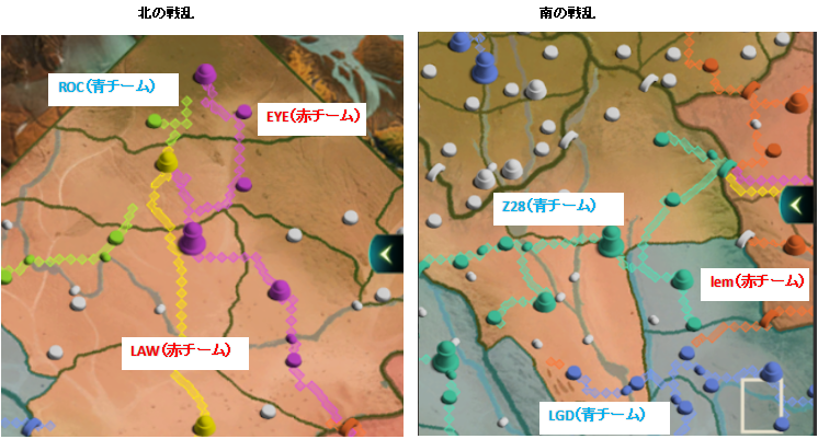 ただ、北の戦乱でEYEはROCと一戦交えたのですが、バフ有利なのにほぼ互角、むしろやや押され気味でした。おそらくROCは敵のNo1チームではないので、さらにつおいチームがいるとなると、けっこうやべえんじゃねえか、と感じた一戦でした。とはいえまだ始まったばかりだし、お互い手探りなので真の勝負はこれからです。