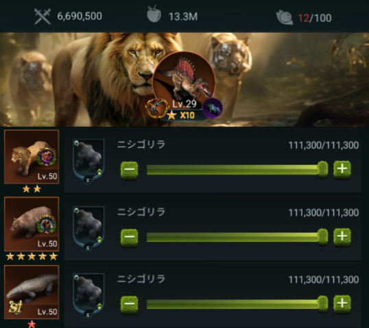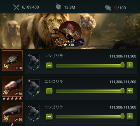 ついに1軍に進展がありました!3匹目のコモドさんがおいでなすって、☆4→☆6にアップしました。これはでかい!特級招集で運よくでました。何も考えてなかったのがよかったのかもしれません。あと地味に巨獣のスピノさんが☆9→☆10になってます。